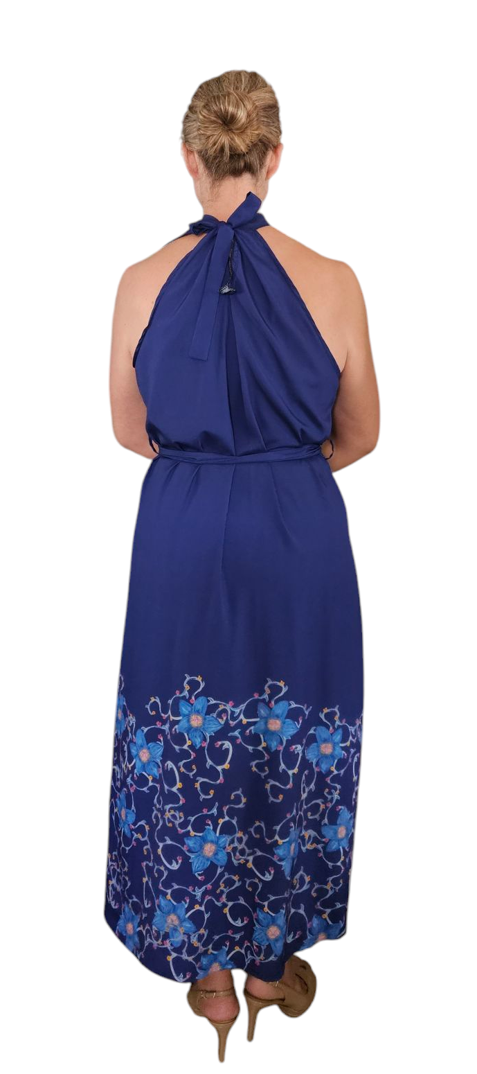 This stunning blue halter dress is the perfect blend of casual elegance and resort chic. If you're looking for dresses for the beach vacation this should be at the top or your list, The vibrant blue fabric is adorned with delicate, hand-drawn floral patterns at both the top and bottom, adding a touch of artistry to the design. The dress features a flattering halter neckline that ties elegantly around the neck, offering a breezy and flattering silhouette.