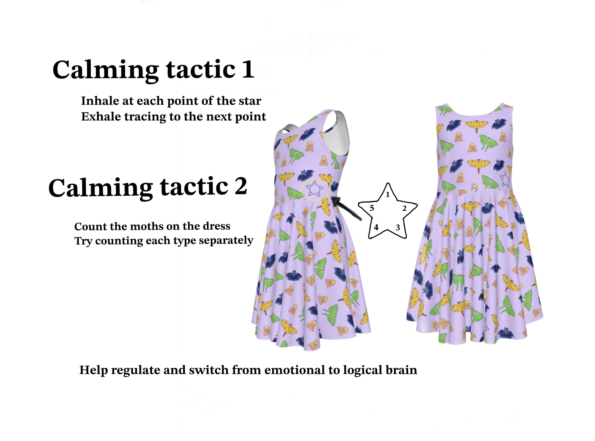 Being a kid can be hard. We take mental health seriously and want to do what we can to help kids navigate their journey. This cute moth dress has a star design on the bodice and skirt that are a reminder to kids to breathe, count, and hopefully calm.